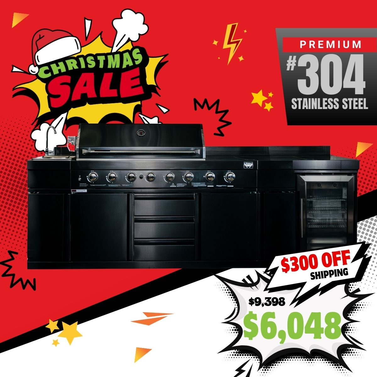Bull BBQ Black Edition Outdoor Kitchen 8 Burner With Sink & Rotisserie with Single Fridge Cooler Module – #304 Stainless Steel