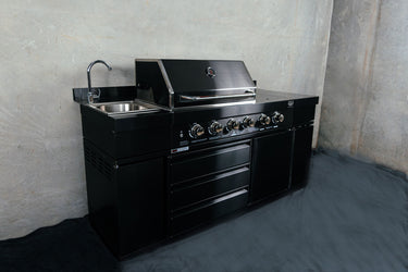 Bull BBQ Black Edition Outdoor Kitchen 6 Burner With Sink & Rotisserie with Single Fridge Cooler Module – #304 Stainless Steel