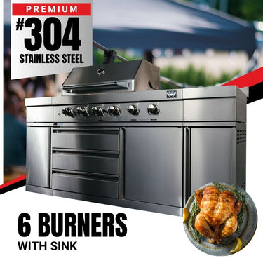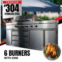 Bull BBQ® Premium 6-Burner Outdoor Kitchen with Sink & Rotisserie – Full #304 Stainless Steel Construction | AGA Certified for LPG & Natural Gas