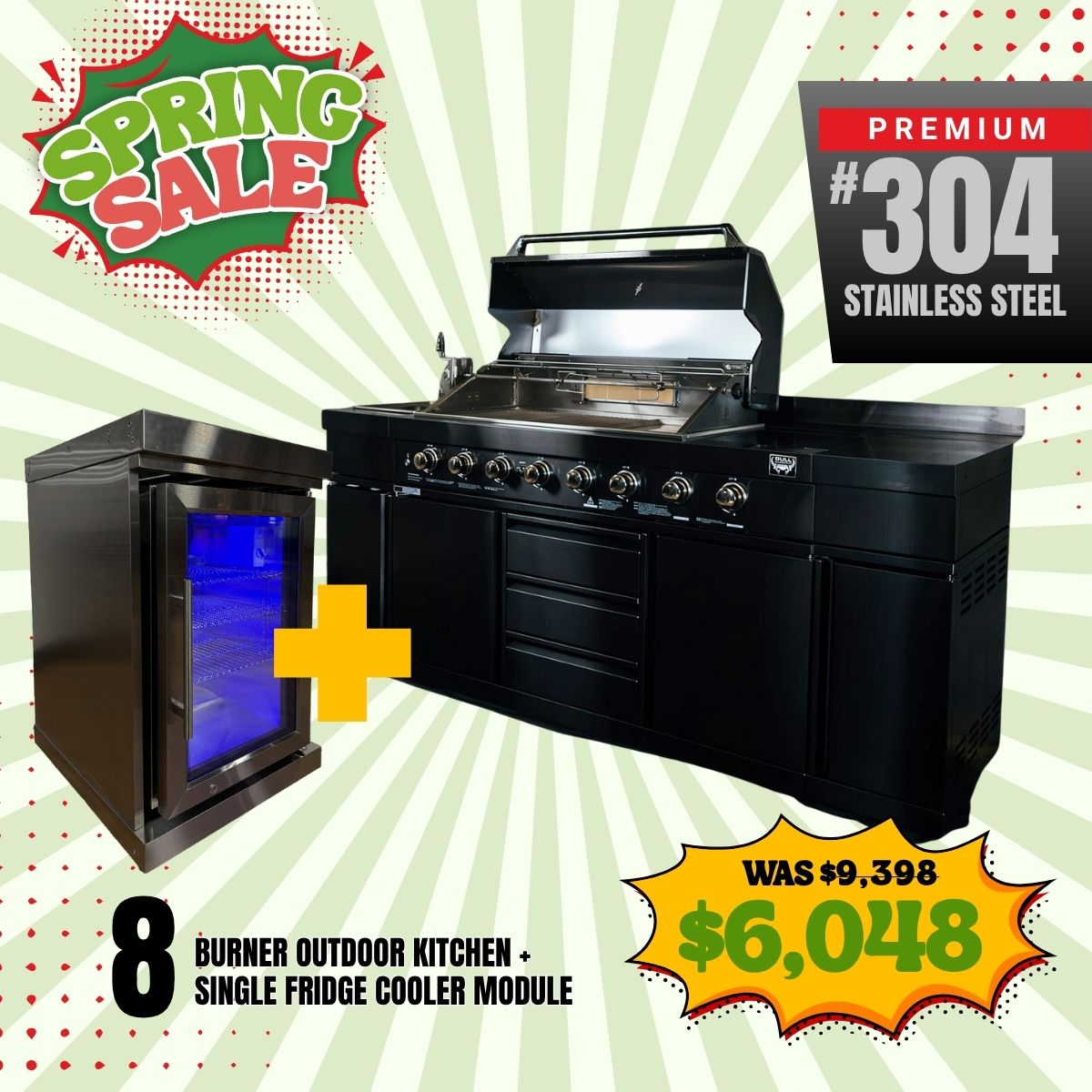 Bull BBQ Black Edition Outdoor Kitchen 8 Burner With Sink & Rotisserie with Single Fridge Cooler Module – #304 Stainless Steel