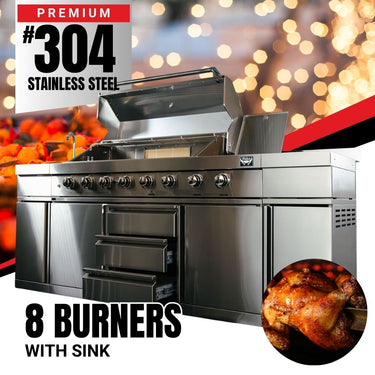 Bull BBQ® Premium 8-Burner Outdoor Kitchen with Sink & Rotisserie – Full #304 Stainless Steel Construction | AGA Certified for LPG & Natural Gas