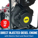 Powered by a robust 10HP 186FA Diesel Engine, this model features Electric Start with Fuel Solenoid Shut-Off, giving you full ignition control directly from the key switchβno more manually choking fuel lines to shut down.
